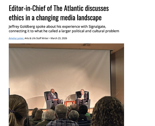 One of the coolest things about teaching, is seeing students pull off cool things. So it was particularly exciting to see Washington & Lee's student newspaper cover the appearance here by Jeffrey Goldberg, editor in chief of The Atlantic. He talked SignalGate, covering the Trump administration's incoherence and why social media sties should be held accountable for posts. READ: