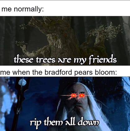 My reaction to all the ornamental pear trees that could have instead been native species that would have actually helped the environment: