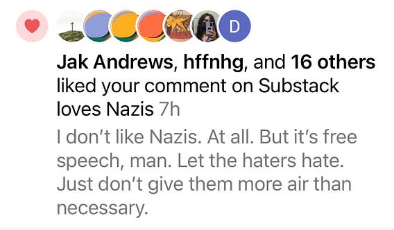 I can get 16 random people (and counting) to like my buried, off-the-cuff comment about Nazis on someone else’s essay—but nary a murmur on my own agonizingly thoughtful Substack Notes. 😂