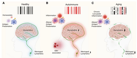The gylmphatics of our brain, which clear waste products, interact with our immune system and are key to preserving brain health, modulating its aging process, and propensity for neurodegenerative diseases A superb review