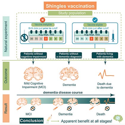 Multiple large natural experiments have documented Shingles vaccine is linked with ~20-25% reduced risk of dementia and Alzheimer's disease. A new report today adds to that and extends the to slowing the progression of dementia