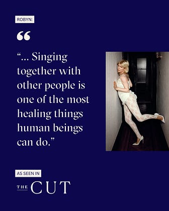 I asked Robyn “What makes live shows so special for you? What do you see as the difference between collective listening and listening to music alone at home or anywhere else?” Read her full response to this and other questions on New York Magazine’s The Cut.