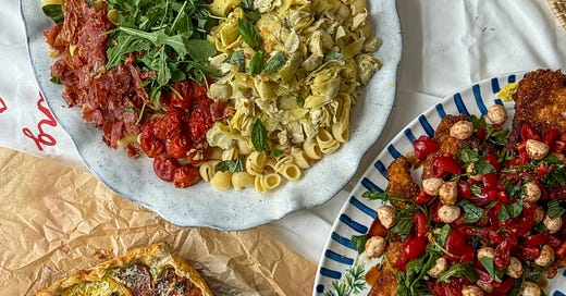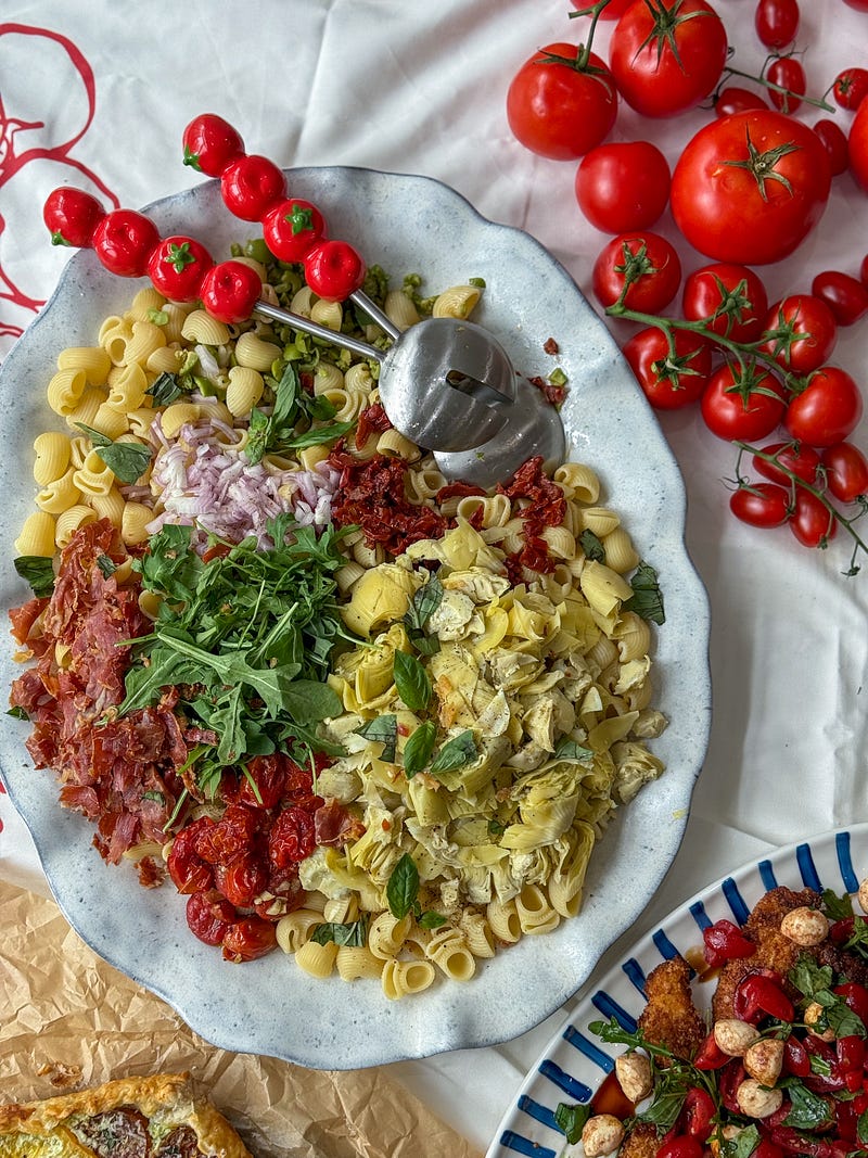 sun dried tomato & burrata pasta pasta salad with crispy prosciutto in a sun dried tomato vinaigrette! find the recipe and more from my tomato themed dinner in my recent substack!