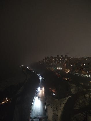 This reminds me of the movie Dark City. It has the same atmosphere. The only thing missing is a Shell Beach billboard.