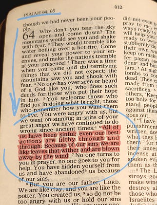 [6] All of us have been sinful; even our best actions are filthy through and through. Because of our sins we are like leaves that wither and are blown away by the wind.