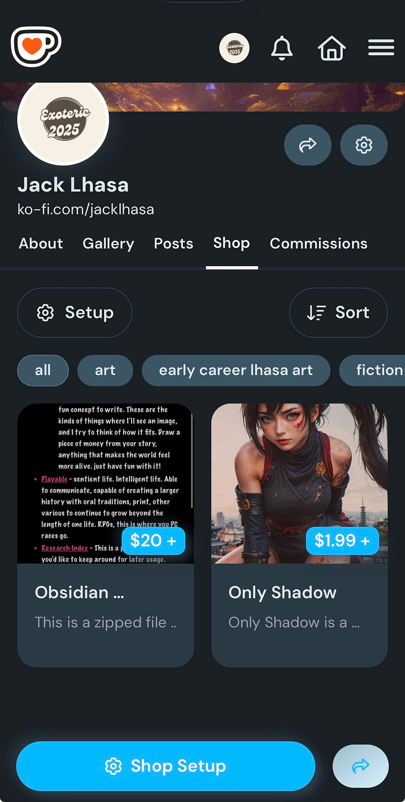 On Ko-Fi I offer 2 subscription options, Commissions, Shop with Templates and PDF (more on the way), and lots of (mostly) free galleries.