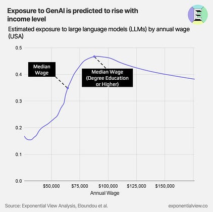 A study published in March 2023 by Eloundou et al. examined the potential effects of GPTs on the labour market, specifically focusing on the tasks they could complete or augment within each profession. They found that 80% of the U.S. workforce could have at least 10% of their work tasks affected by LLMs. This is over 130 million people in the U.S. alone. Moreover, this impact rises significantly with income, affecting tasks within white-collar jobs the most.