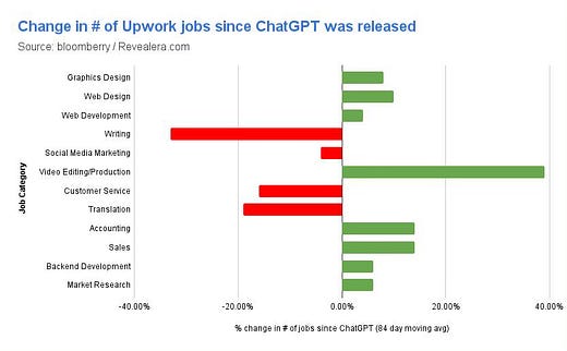 Freelance work has changed since the release of ChatGPT in November 2022, according to some data from Upwork. There’s a clear drop in writing and customer service gigs, but graphics and video work are still going strong.