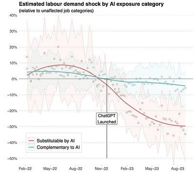 Fascinating new paper, finds that work demand has fallen in areas where LLMs are substitutive (such as writing) but grown in areas which are complementary (such as as ML).
