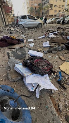 Toys, a backpack, and schoolbooks scattered in the street, children killed in their sleep at dawn today after an Israeli airstrike struck their home in Gaza.