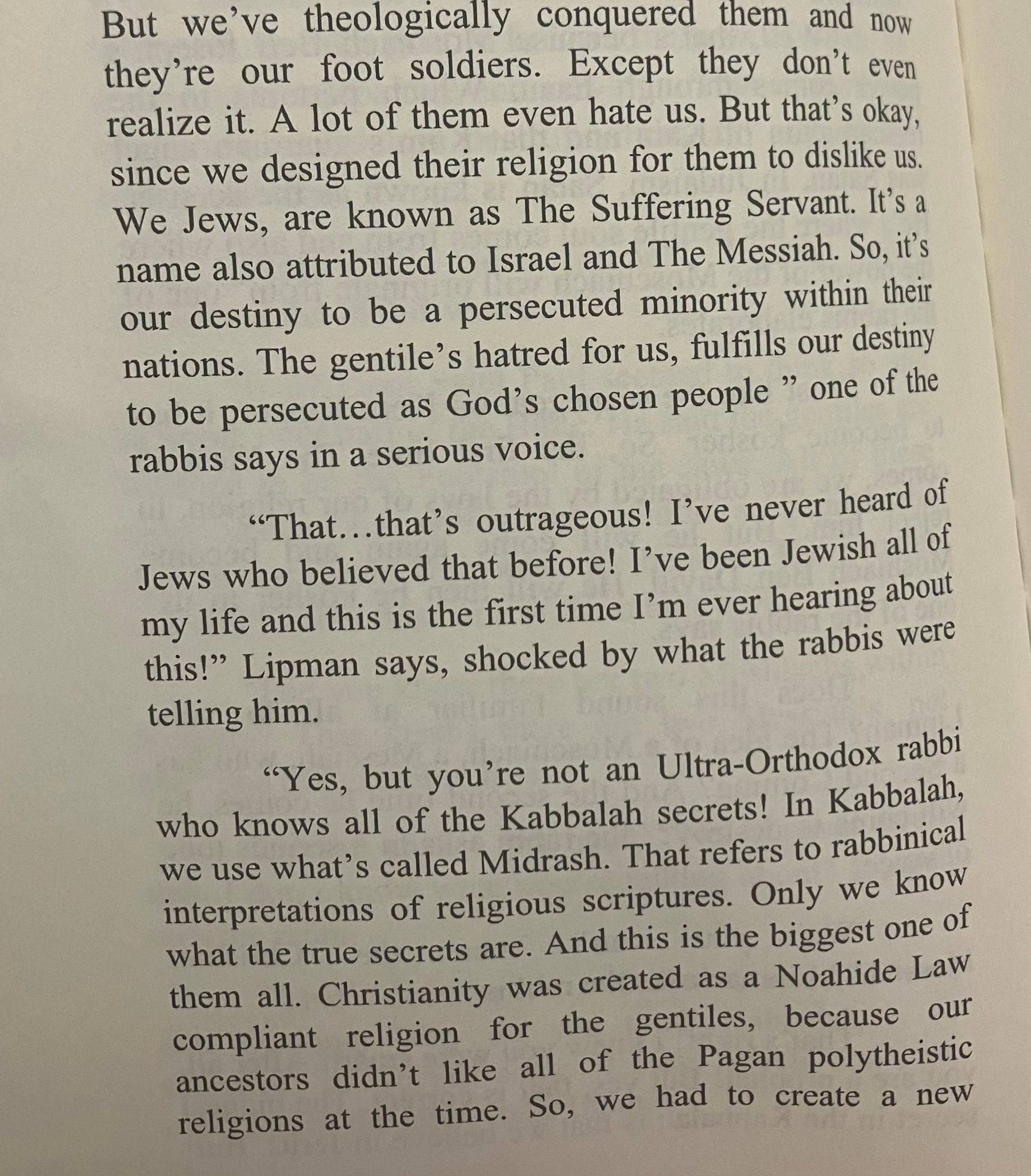 "Kabbalah of the Crocodile" is my horror novel about how Christianity is a Jewish Psy-Op. I've toured many podcasts dedicated to conspiracy theories about this novel, largely because this book predicted synagogue tunnels. In the novel, the evil rabbis have tunnels used for child sacrifice. The rabbis seek to brainwash all gentiles into becoming Christians, because Christianity was created as a religion that forces gentiles to submit to their Jewish god, which Christians obey.