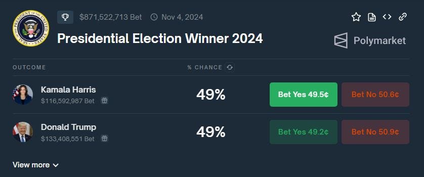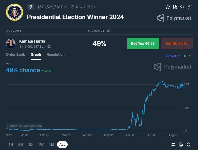 Nearly a month since my “peak Kamala” call, we have some interesting action via Polymarket. First, her 53% DNC edge unraveled as expected. Now, we have a post-debate bump up to 49% from a low of 45% just yesterday (still off my peak call). It is now essentially a toss up according to the prediction market bettors. I happen to agree.