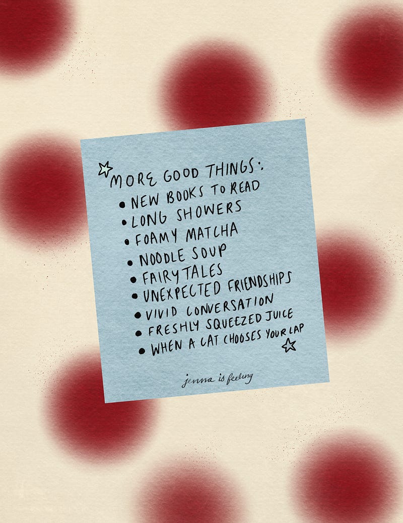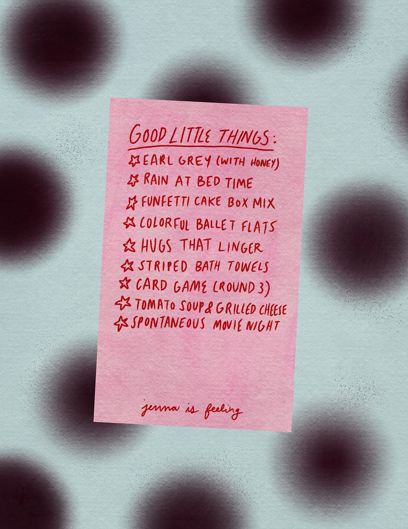 Start a “joy log” in a journal or your notes app and add to it every time something little or big delights you. It’s great to go back to and read on rainy days.