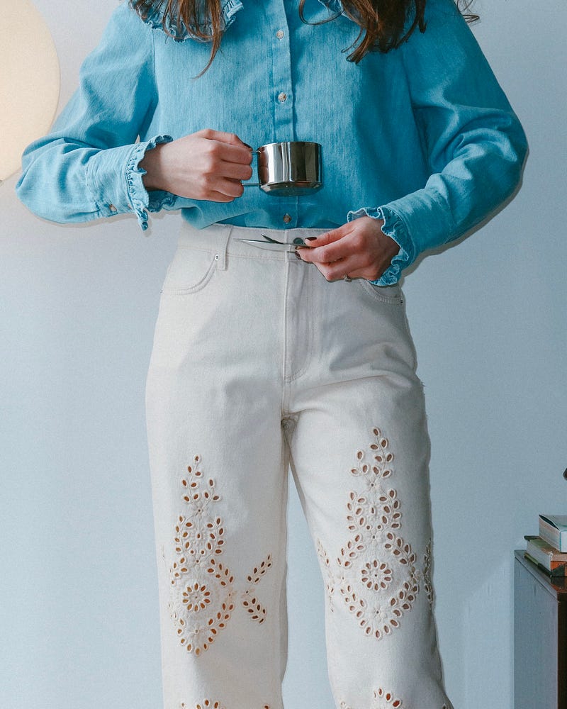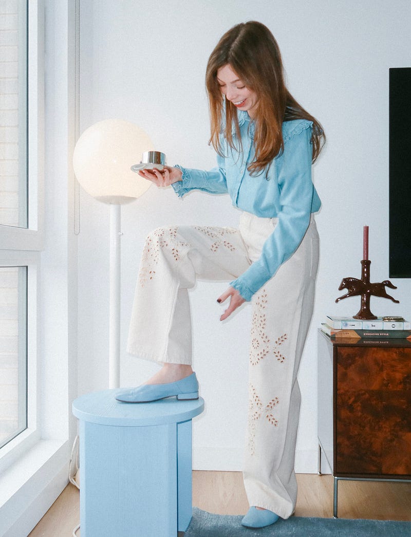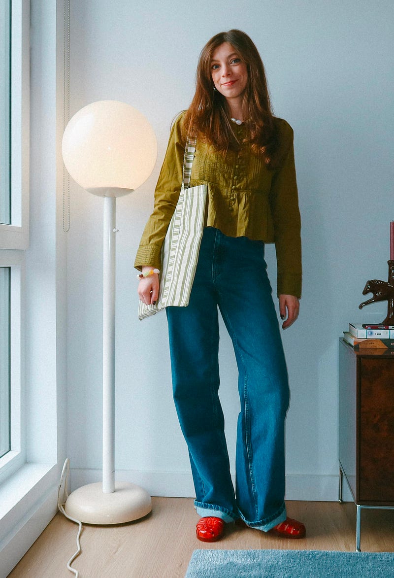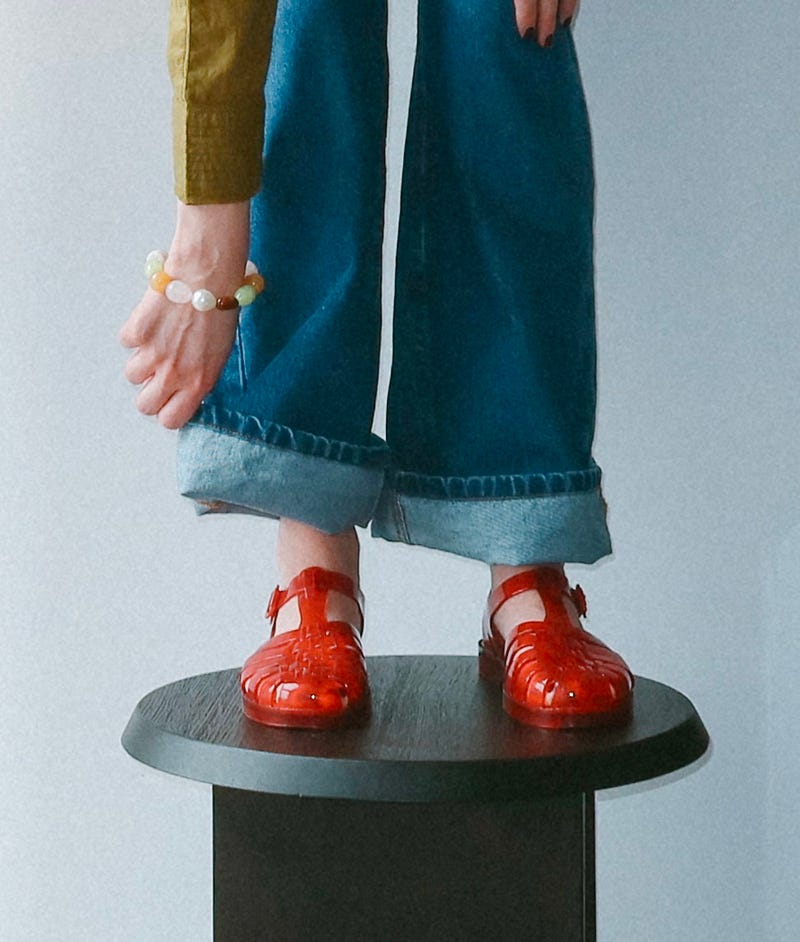 Spring outfit and color inspiration: stone pastels, jewelry that looks like candy, soft denim, and jelly shoes.