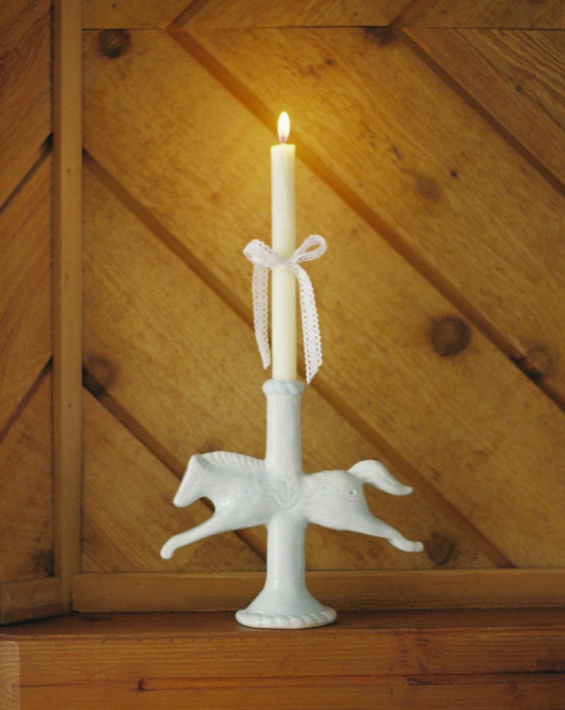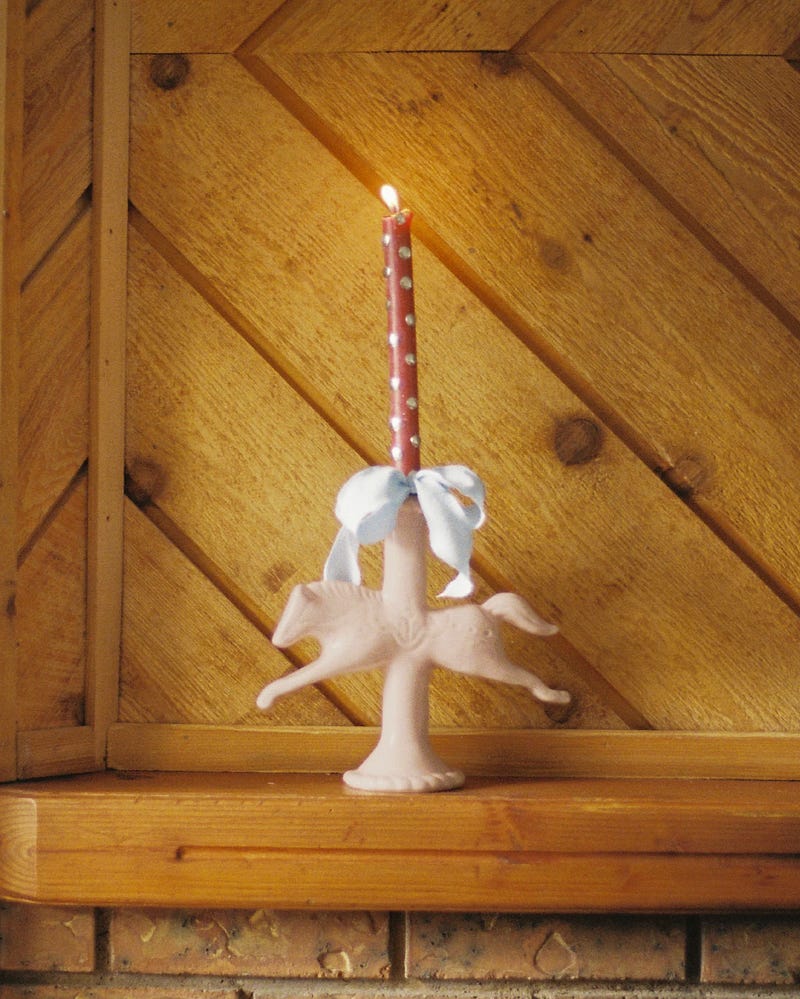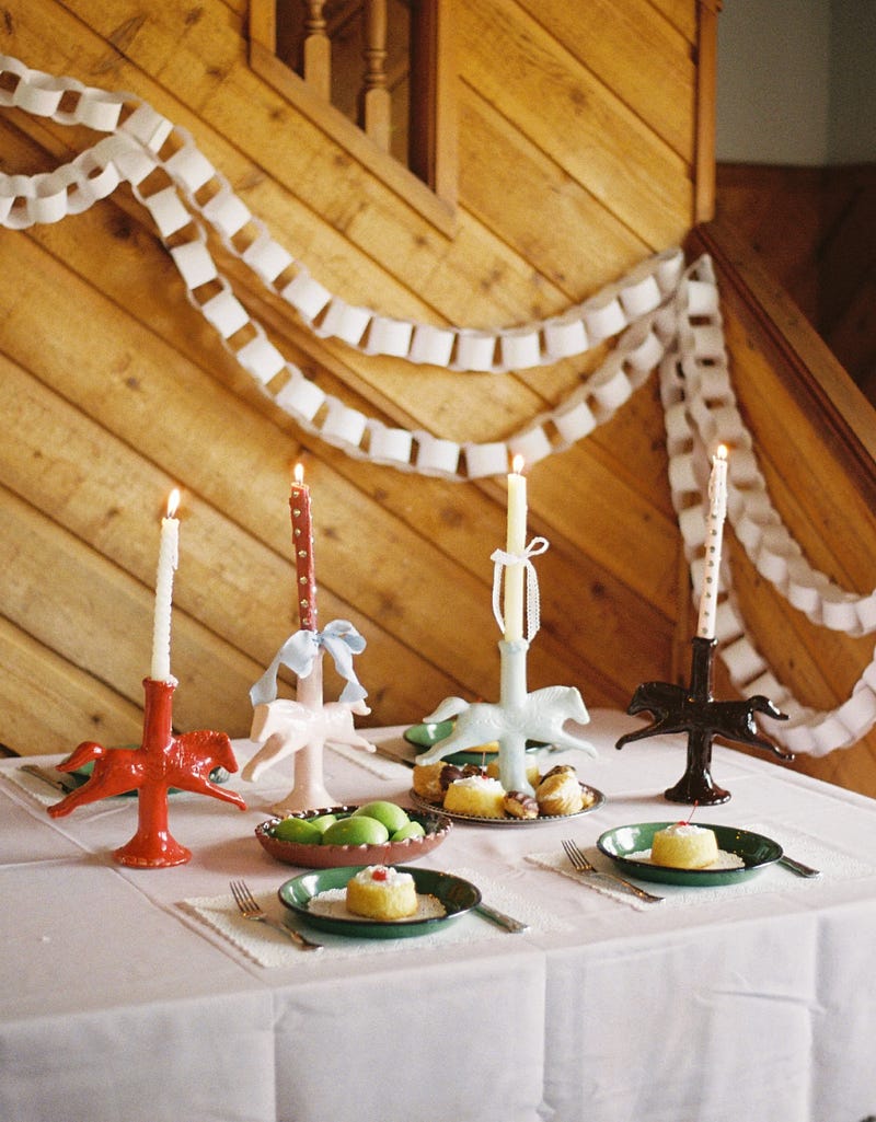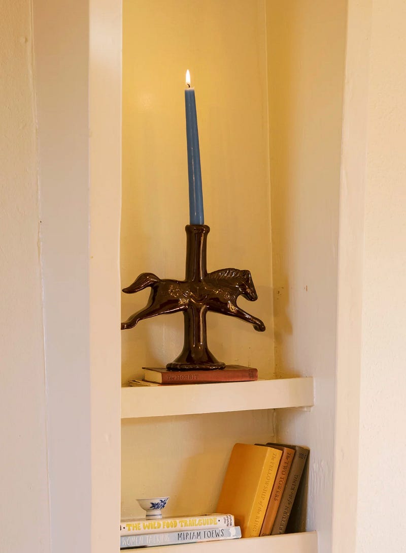 The ceramic horse-shaped candlestick holders of small business, St. Bingo. Each horse is glazed by hand.
