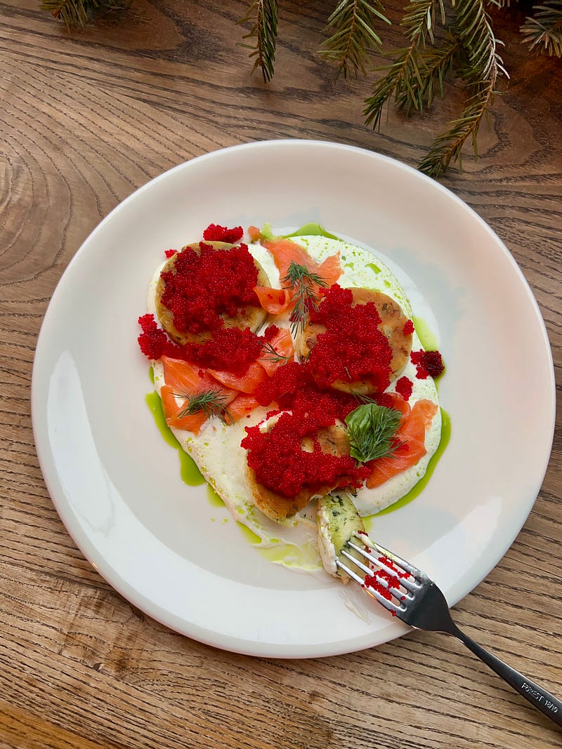 He made me some of his savoury syrniki with smoked trout and flying fish roe and it was superb.