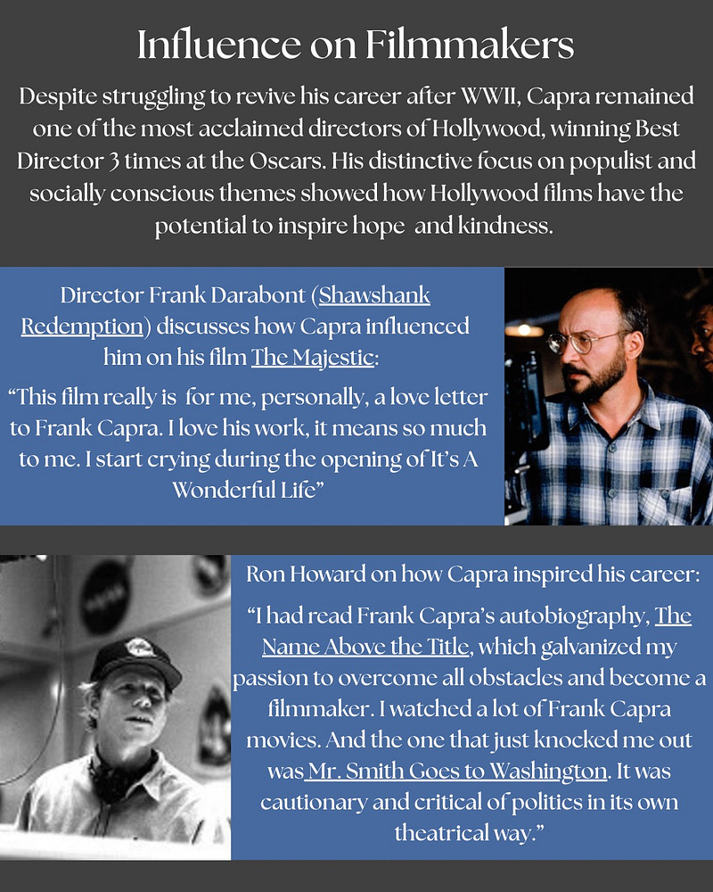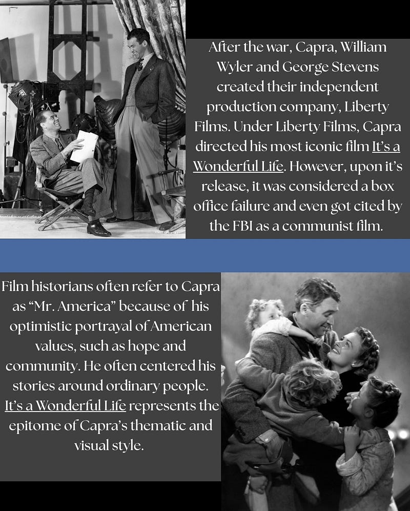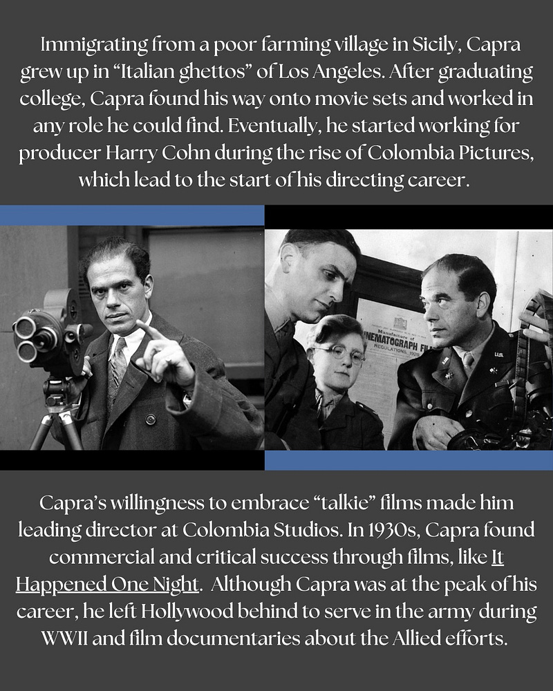 This week for our Filmmaker Profile, we are highlighting the work and legacy of Italian American director Frank Capra. Immigrating from Sicily to Los Angeles, Capra had an impoverished upbringing, but through his determination and confidence, he soon became one of the top directors of Hollywood. Capra developed a distinctive style that translated into all the different genres he directed. Later given the nickname "Mr.America" Capra approached each of his films with the mission to inspire hope and optimism through underdog stories about ordinary people. Capra is the second most awarded director at the Academy Awards, winning Best Director three times with two of his films (It Happened One Night and You Can't Take It With You) also receiving the Best Picture Oscar. ⭐️