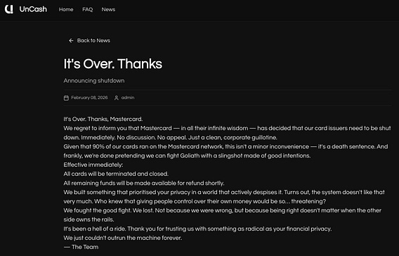 A notice posted on the service's site (image below) states in part: "It's Over. Thanks, Mastercard.We regret to inform you that Mastercard — in all their infinite wisdom — has decided that our card issuers need to be shut down. Immediately. No discussion. No appeal. Just a clean, corporate guillotine.Given that 90% of our cards ran on the Mastercard network, this isn't a minor inconvenience — it's a death sentence. And frankly, we're done pretending we can fight Goliath with a slingshot made of good intentions."