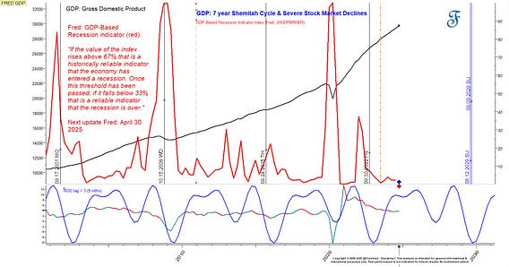 The stock market and economy don't always align. Despite a recent US downturn, the GDP's Rate of Change shows no recession signs yet. Severe declines often follow the 7-year Shemitah cycle (2001, 2008, 2015, 2022). A potential drop in 2029, a Shemitah year, could be (more) significant.