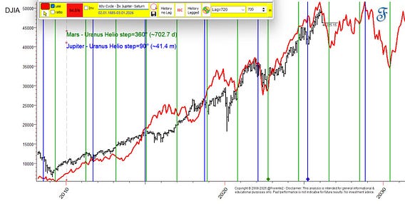 The 60-year cycle is known in many cultures as a major cycle. Over this period, societal themes and stock market patterns recur. Mapping cycles of Mars/Jupiter/Uranus onto a forecast reveals potential future inflection points. Note: LT cycles may deviate by 8 months or invert. No advice.