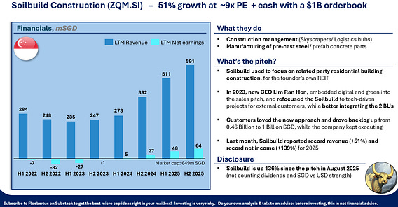 Soilbuild Construction reported 64 mSGD net income for 2025, putting in its second 50% revenue growth year in a row. Backlog suggests more growth is coming. Still sits at only 9-10x earnings.