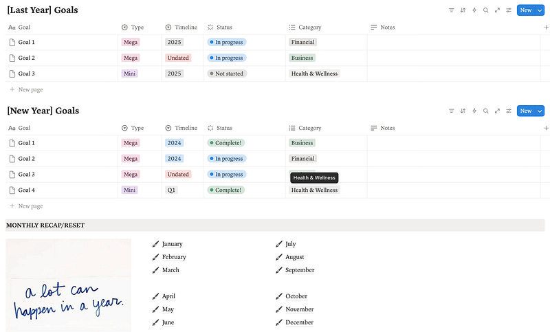 For those asking about the notion template I use for monthly closeouts, new year’s goal planning and tracking, etc. I have linked it below!