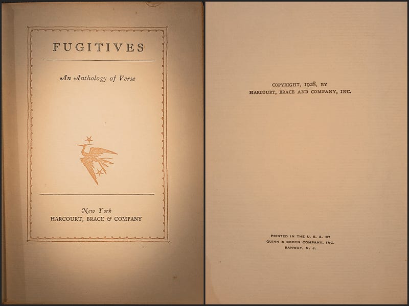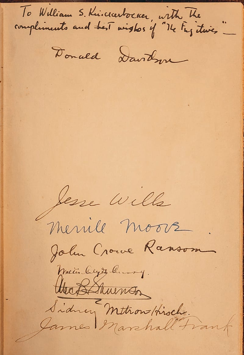 Santa came through with a 1st Edition of the Fugitives Anthology inscribed by Donald Davidson to William S. Knickerbocker, editor of The Sewanee Review, and signed by many of the original Fugitive Poets.