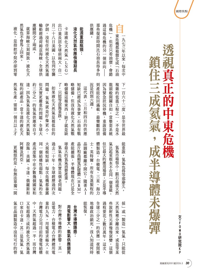 在最新一期的《商業周刊》專欄中,我深入拆解了這場危機最深層、也最少人注意的第三個面向:氦氣(Helium)。