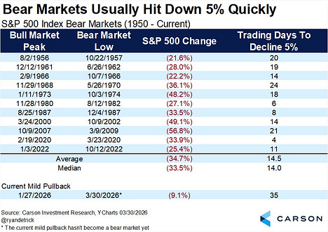 對比一下歷史上真正的熊市:過去11次熊市,市場跌去5%平均只需要不到15個交易日。換句話說,真正的熊市在最初的三週內就會給你一記重拳,而這次,市場卻花了七週時間才完成一個輕微的刺拳。