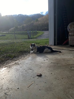 This evening Edgar hung out with me in my garage studio while I worked on stripping down a table I’ve been working on for months as one of those projects meant for a weekend, but has been drawn out and crammed into the found moments between other tasks. I’ve spent so much of the past two months doing art admin work behind a screen that it was lovely to just focus on the repetition of sanding and the quiet chomping of cows in the pasture.