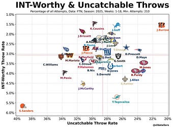 This chart has been making the rounds, and it’s a really good example of how NFL analytics have come to overvalue efficiency relative to production. If you think Geno Smith had a better year than Patrick Mahomes, you should never be allowed to watch football again.