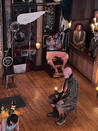 And they are competing to tell the narrative, but then the show presents itself as a last minute performance, made up of random audience members—they literally bumble onto the stage from the audience, playing different London audience tropes including a steward.