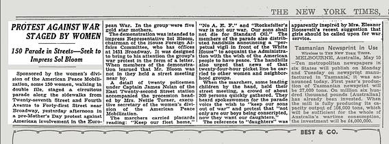 Sponsored by the women's division of the American Peace Mobilization, some 150 women, walking in double file, staged a circuitous parade along the sidewalks from Twenty-seventh Street and Fourth Avenue to Forty-first Street near Broadway, yesterday afternoon in a pre-Mother's Day protest against American involvement in the Euro pean War.