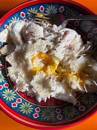 my go to breakfast when i don’t want to think about it - eggs, rice, sauerkraut & za’atar (from Cannan, Palestine). good for spleen (focus) kidney (energy) liver (ambition) and heart (because this meal brings me joy and that’s the most important part)