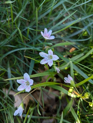 My life is full of stress and worry this spring. Seeing the Spring Beauty, Claytonia virginica, blooming this evening, though, put a smile on my face. I added eight dormant plants to two areas of lawn last summer.