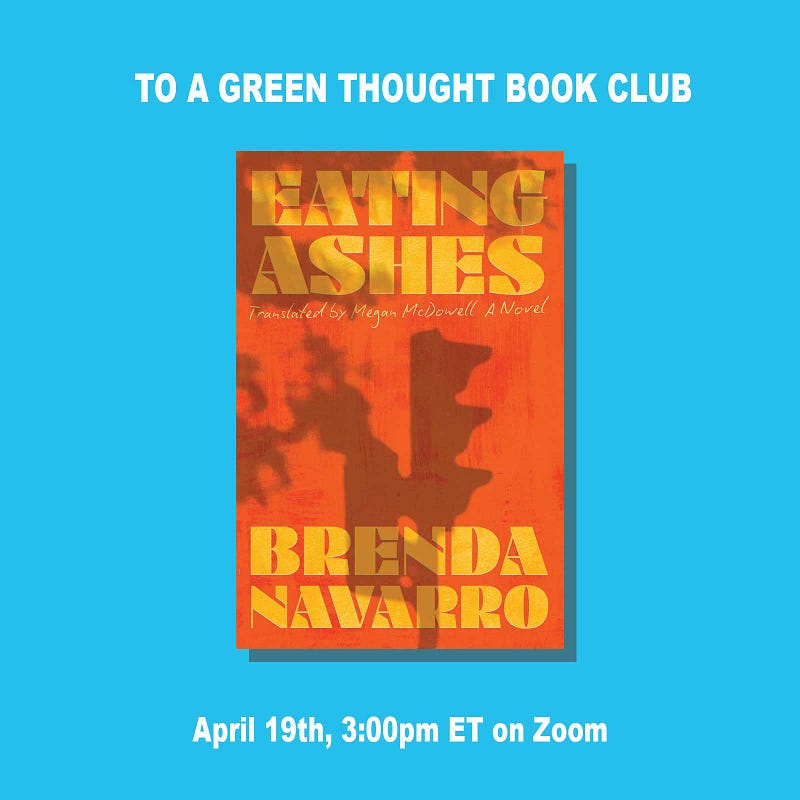 Please join us as we read Brenda Navarro's extraordinary EATING ASHES, tr. Megan McDowell. Meetings are open to all Founding Members of the newsletter. You can read my thoughts on book clubs (& why I love them) & sign up here: