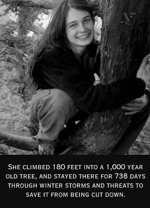 There is an entire valley of ancient giant trees of unparalleled beauty and grandeur that only exists in the south west of Vancouver Island BC, Canada today because thousands of people chose to stand up and put their lives on the line in similar ways to Julia to protect that valley (with over a thousand people getting arrested in Canada’s largest act of civil disobedience in history) in 2021. That valley is called Fairy Creek.