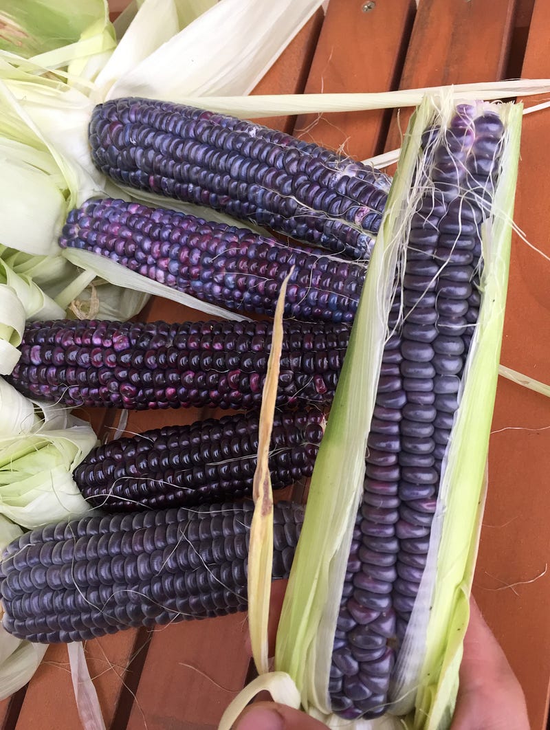 I love to both eat the ears when young and creamy colored as sweet corn we also let many ears mature to this deep blue/purple color for grinding into masa for making tortillas.