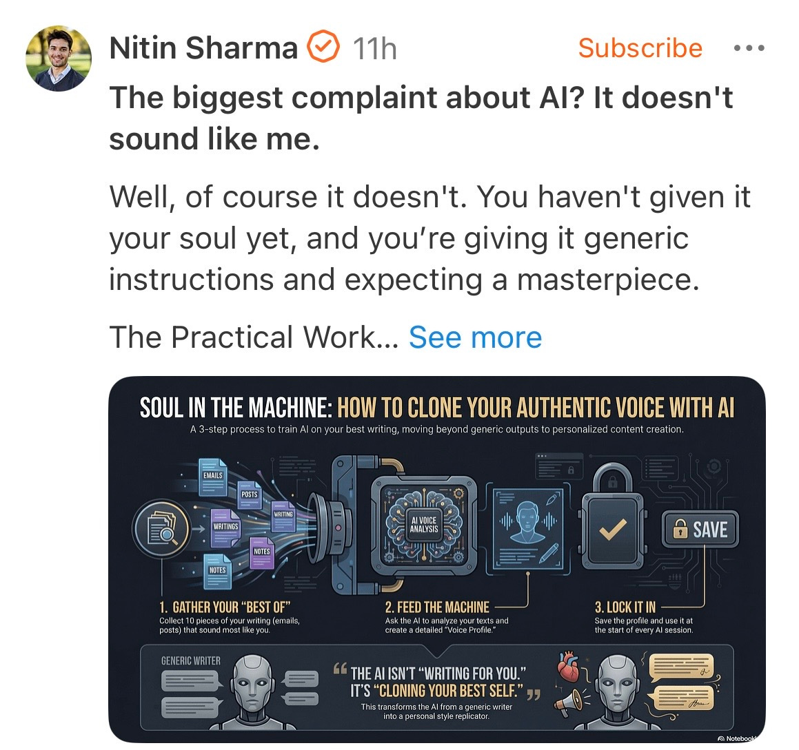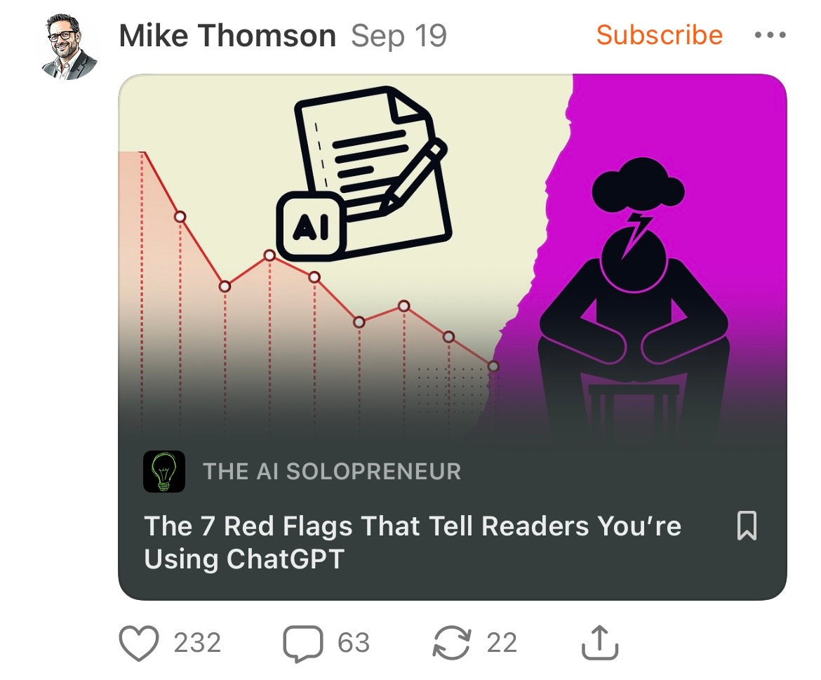 So he doesn’t want to scare people away from becoming a subscriber because they don’t like reading AI generated content, so he doesn’t tell them it is AI generated, but then also says he stands behind the writing entirely?
