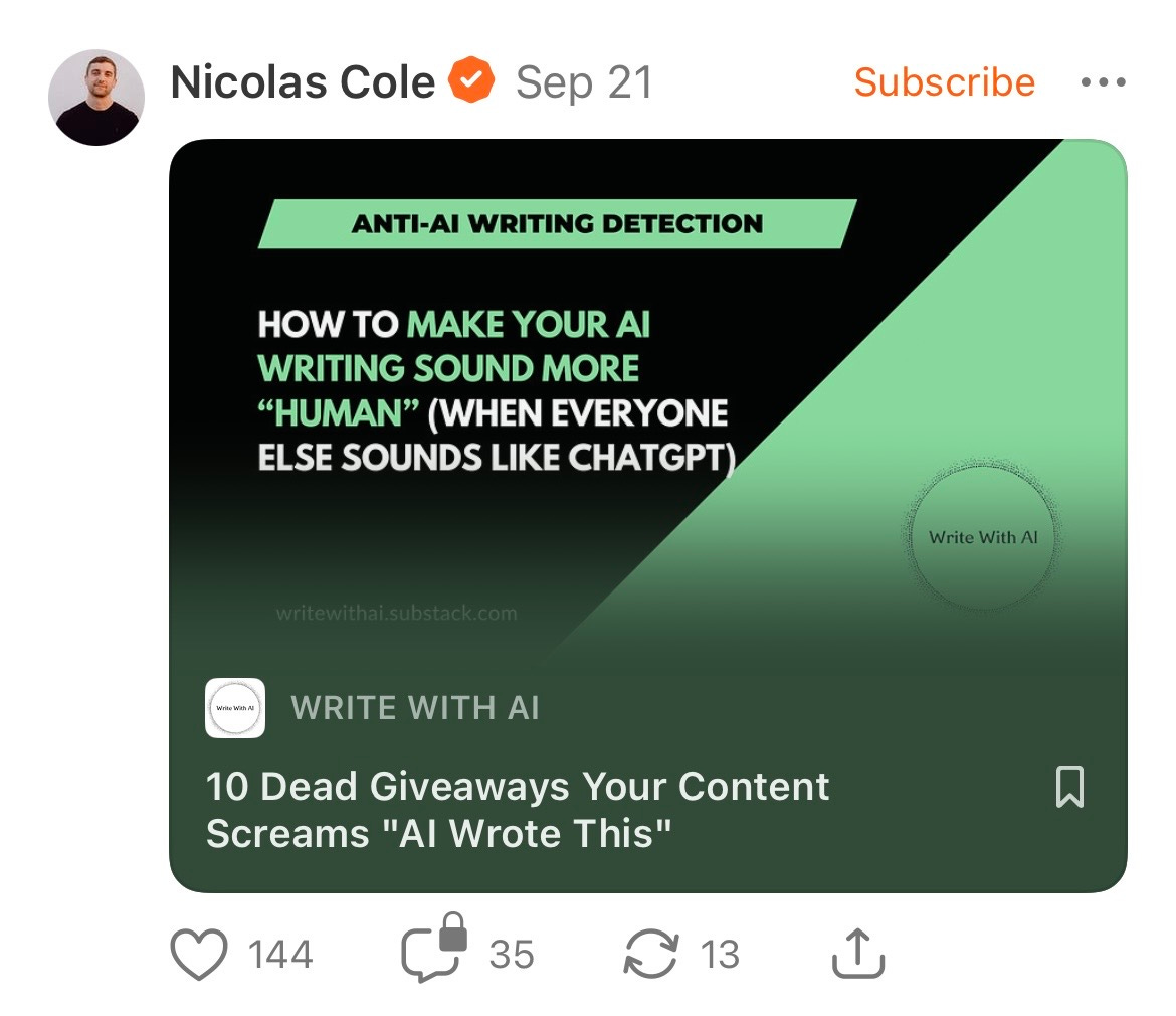 Substack is filled with Chatbot slop specialists publishing material intended for coaching in the closet A.I. Dependant Writers to pretend their writing is 100% written by humans.