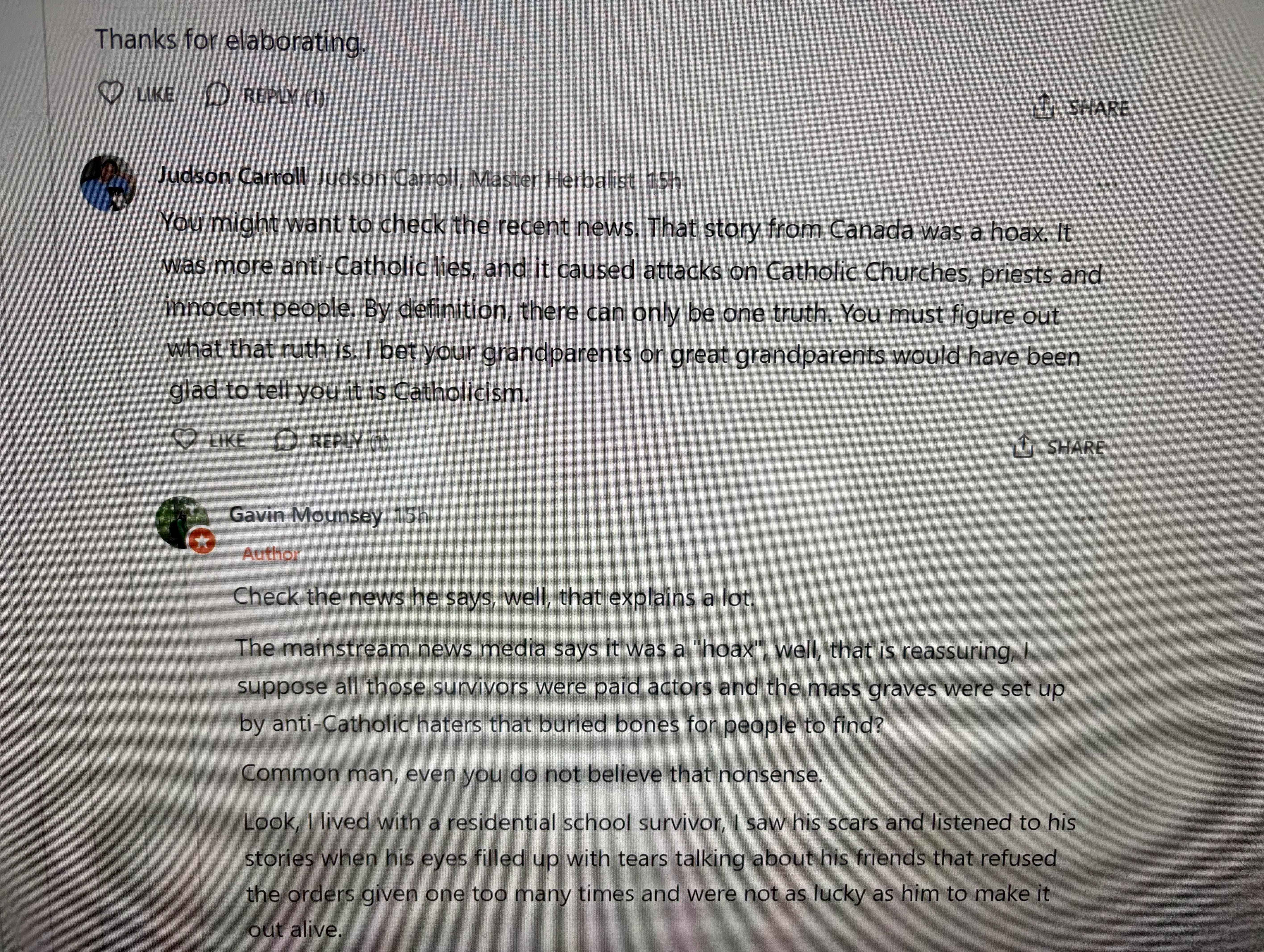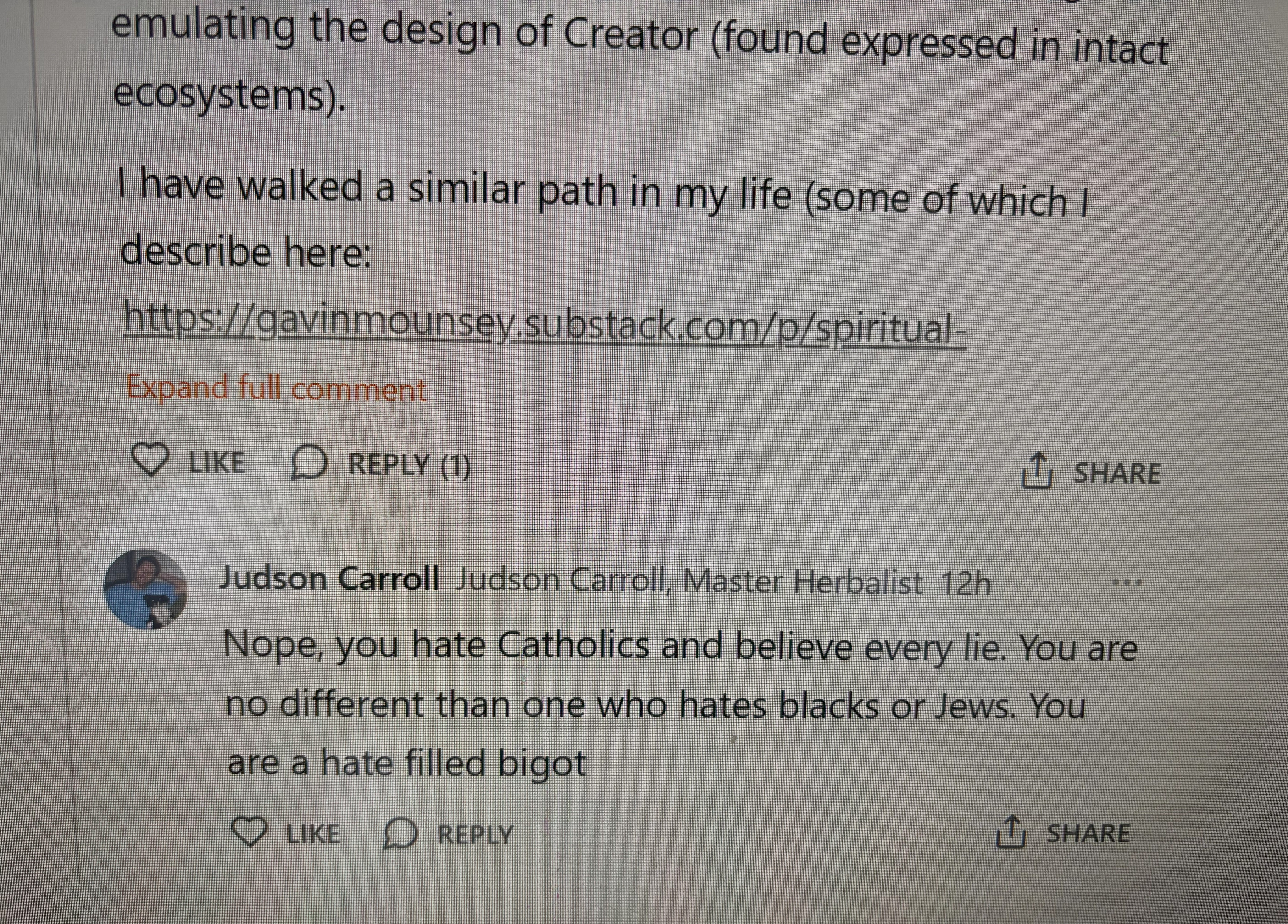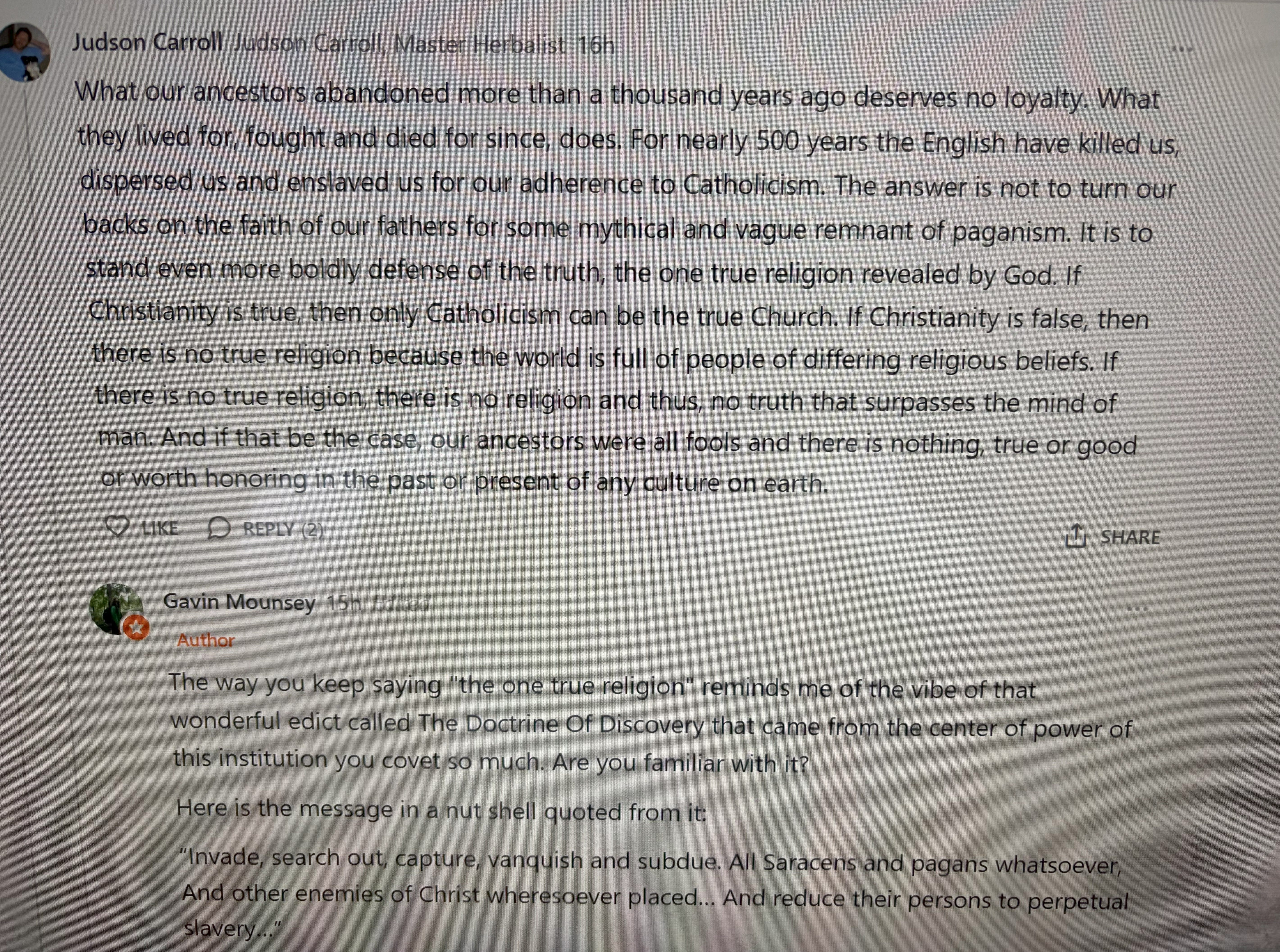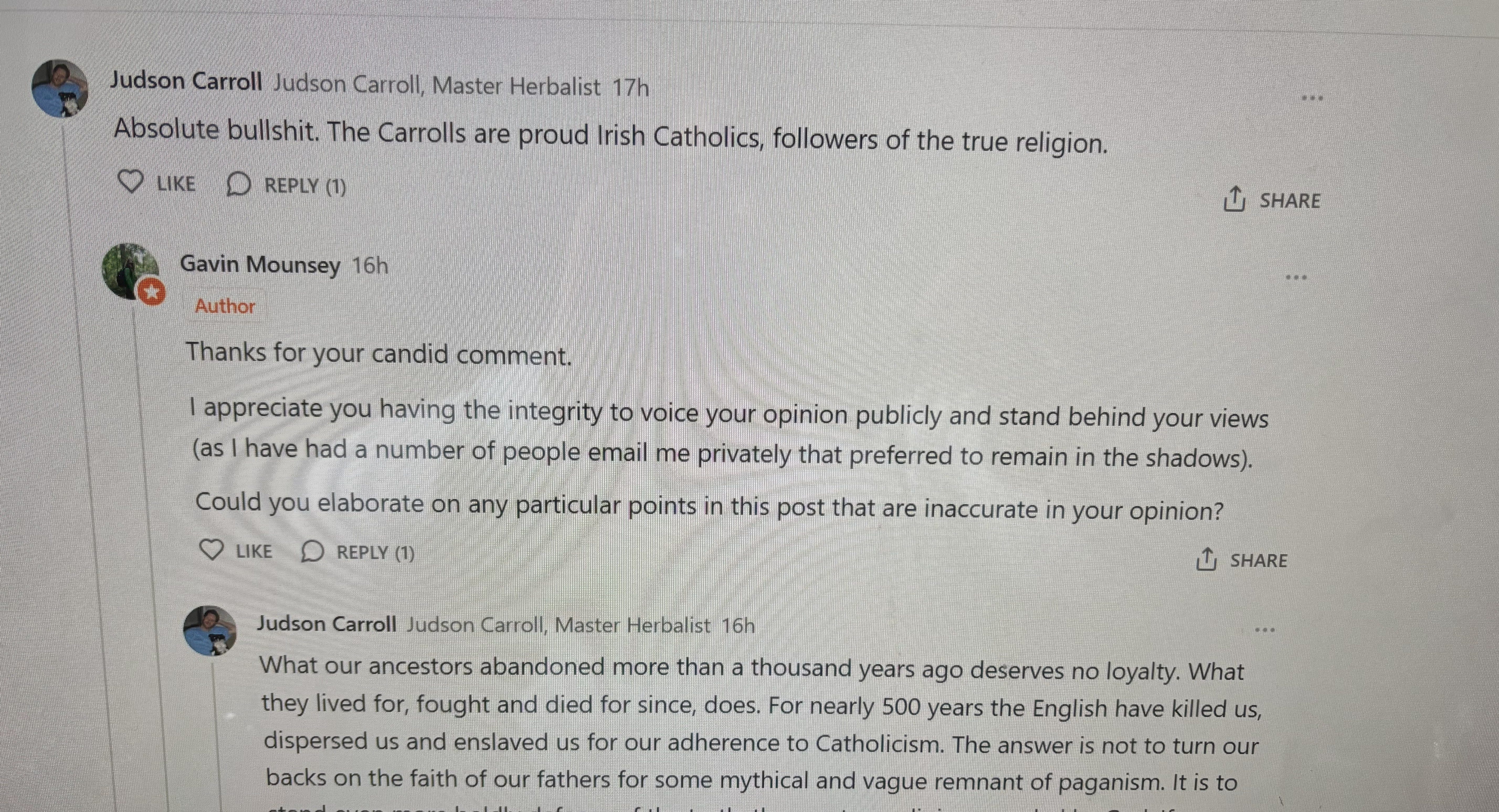 So, Judson Carroll (a guy that claims to be a herbalist, yet simultaneously describes indigenous people which his books derive their ethnobotanical knowledge from as “vague remnants of paganism”) showed up on my Decolonizing St. Patrick`s day post to tell me he thinks it is bullshit and repeatedly yell about how he is part of “the one true religion”.