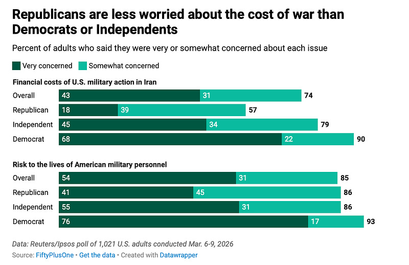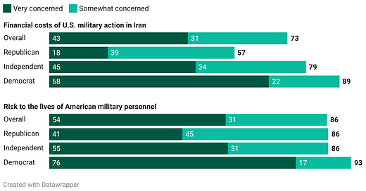 73% of Americans say they are worried about the financial cost of Trump's war in Iran, including 79% of political independents. Nearly 9 in 10 Americans are worried about the lives of military personnel