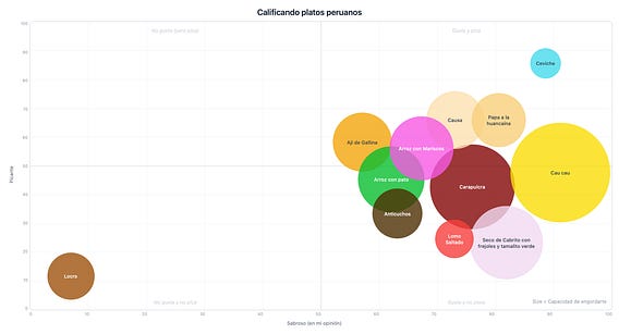Esta es una clasificación de algunos platos peruanos en nivel de picante y nivel de sabrosura (el tamaño de la burbuja es cuánto engordan) 😅