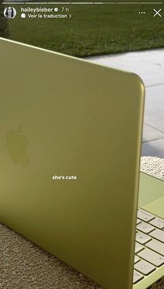 Parece que Apple eligió a Hailey Bieber, la reina del público Gen Z, para promocionar la MacBook Neo y el color citrus (para mí es contenido pago).