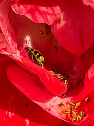 [Spotted cucumber beetle, exploring the inside of a rose in the warm morning sunshine, as was I.]💗❤️💗