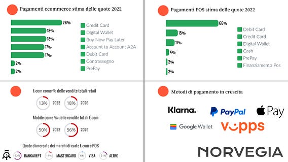 Per gli acquisti online ci sono cinque metodi di pagamento con quote simili. I norvegesi hanno uno dei tassi più alti al mondo di utilizzo del Buy Now Pay Later con il 18% del valore delle transazioni.