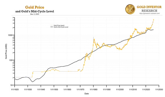 The embedded, monetary inflation impact on the gold is well captured by what we call gold’s mid-cycle level. Essentially, it can be seen as the slow-moving, trending component of the gold price which is solely based on fundamentals and not on the gold price itself (such as a moving avg.)