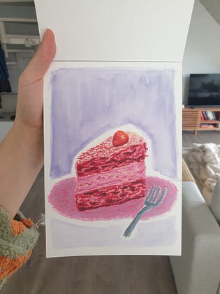 this past weekend i drew a cake slice and then proceeded to ruin it with my terrible watercolor skills, what did you do?