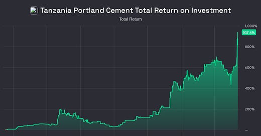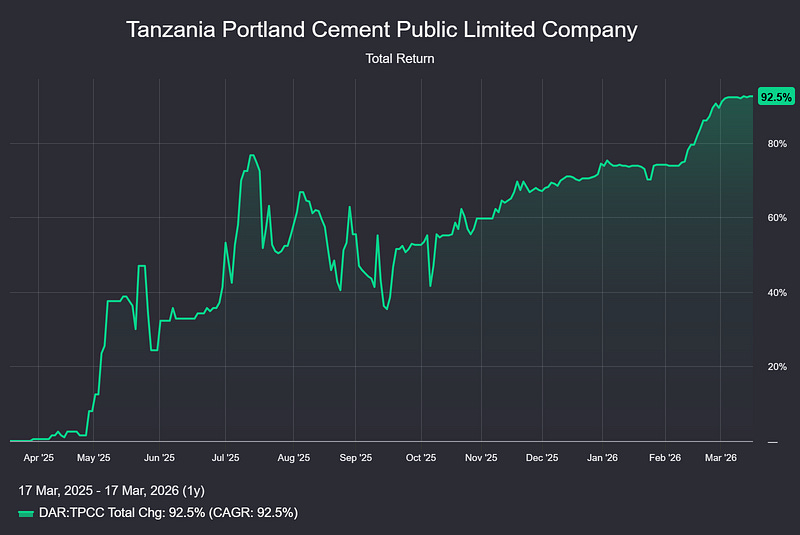 Tanzania Portland Cement has brought a total return (share price appreciation & Dividends) of approximately 92.5%, within one year, to shareholders, which is approximately 7.70% per month.