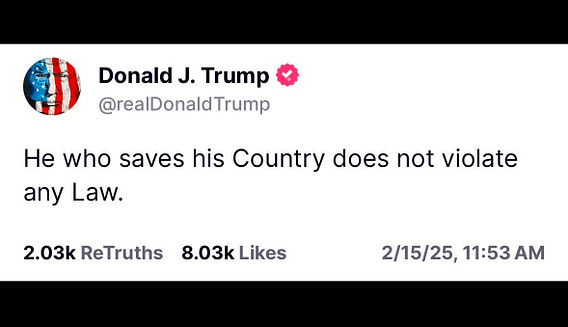 The sad fact is this lawless pronouncement by Trump is damn-near a quote from the democracy-busting presidential immunity ruling from our compromised Supreme Court.